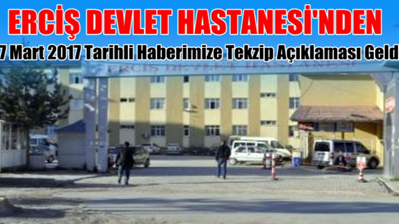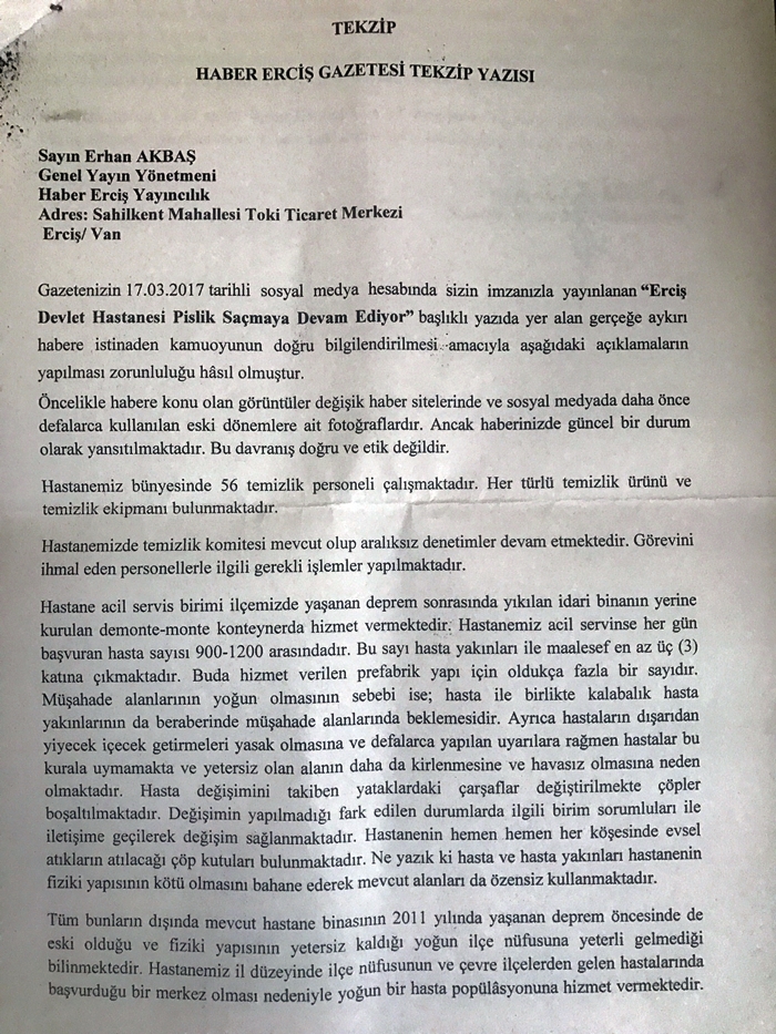 Gazetenizin 17 mart 2017 tarihinde yayınlanan Erciş Devlet Hastanesi pislik saçıyor isimli haberde yer alan gerçeğe aykırı habere istinaden kamuoyunun doğru bilgilendirmesi amacıyla aşağıdaki açıklamanın zorunluluğu hasıl olunmuştur.