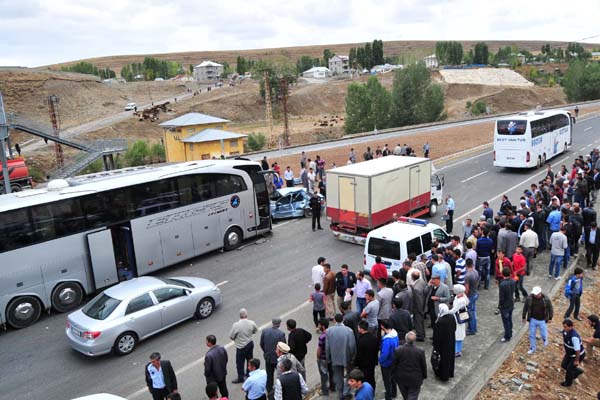 Eleşkirt’te şehirler arası otobüs terminalinden köyüne gitmek üzere hareket eden Halis KAYA(65) yönetimindeki 16 EB 861 plakalı otomobilin ters yola girmesi sonucu İbrahim GÜRBÜZ yönetimindeki 50 DK 017plakalı otobüs kafa kafaya çarpıştı.