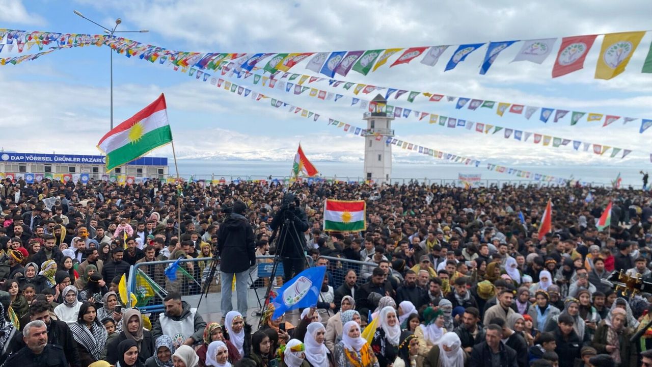 "Newroza Azadî û Yekitiya Demokratik" ve "Özgürlük ve Demokrasi Newrozu" sloganlarıyla düzenlenen kutlama için toplanan kalabalık, Van Gölü kıyısındaki Fener Alayı'nda buluştu. Alanı dolduran binlerce kişi, "Özgür yaşam özgür Önderlikle gelecek" yazılı pankart eşliğinde müziklerle halay çekti.