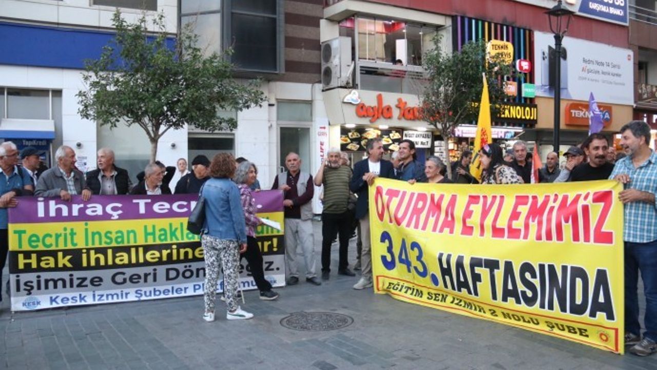 Kamu Emekçileri Sendikaları Konfederasyonu (KESK) İzmir Şubesinin, Kanun Hükmünde Kararnamelerle (KHK) işten çıkarılmaları protesto etmek amacıyla her çarşamba düzenlediği oturma eylemini 343'üncü haftasında da Karşıyaka çarşı girişinde devam ettirdi. “İhraç tecrittir. Tecrit insan hakları ihlalidir. Hak ihlallerine hayır. İşimize geri döneceğiz” pankartı açılan açıklamada sık sık "Hak hukuk adalet", "KESK'li ihraçlar onurumuzdur", "Savaşa hayır barış hemen şimdi" sloganları atıldı. Açıklamaya kentte bulunan siyasi parti ve kurum temsilcileri de katıldı.