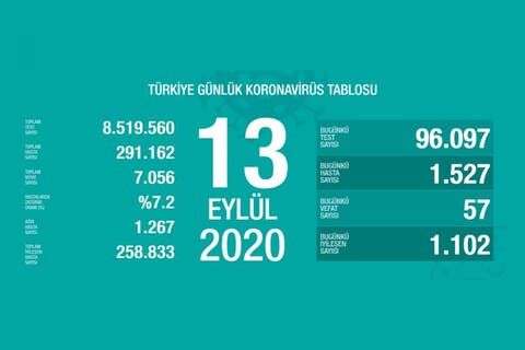 Sağlık Bakanı Fahrettin Koca, Türkiye'de koronavirüs nedeniyle 57 kişinin daha hayatını kaybettiğini, bin 527 yeni vaka tespit edildiğini açıkladı. Koronadan ölen sayısı 7 bin 56'ya, vaka sayısı 291 bin 162'ye yükseldi.