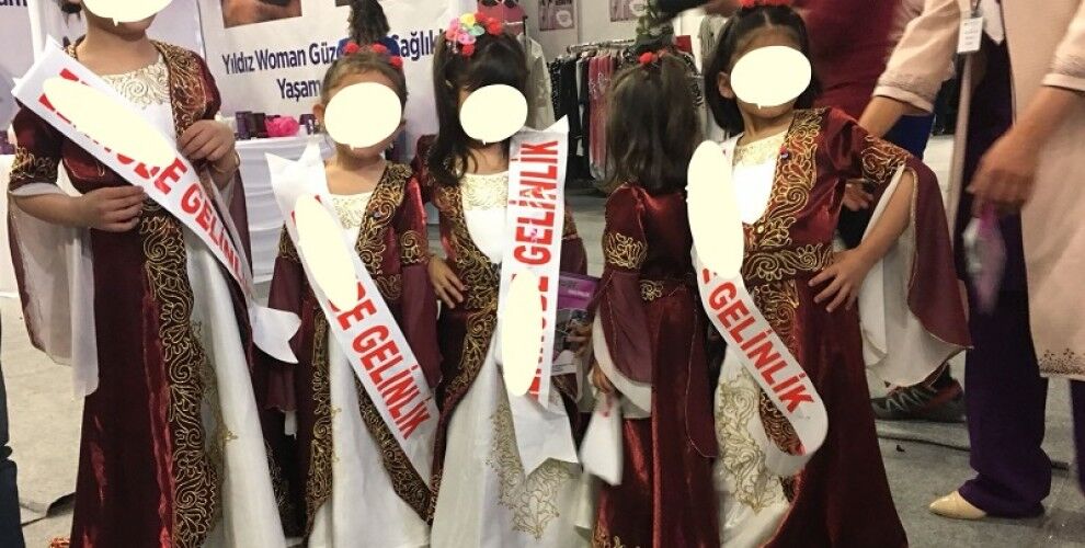 HABER MERKEZİ-Çocuk yaşta evliliklerin teşvik edildiği ve aralarında Kamu Kurumlarından KOSGEB ve Müstakil İş Adamları Derneğinin (MÜSİAD) aralarında bulunduğu bir çok kurum tarafından organize edil en ‘Evlilik Fuarı’, devam ediyor. Kız çocukları, evlilik ihtiyaçlarını karşılayan bazı firmaların tanıtım malzemesi yapılarak, nişan elbisesi ve gelinlik giydirilerek standlarda gezdiriliyor.