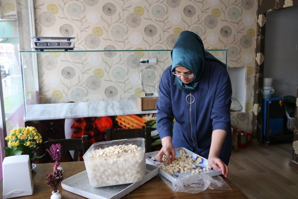 İçli köfte ve mantıyı sıcak servis ettiklerini dile getiren Ertaş, “Daha önce sıcak yemek veriyorduk. Ama yerimiz ufak olduğundan kaynaklı biz yemeği kaldırdık. Bunun yanında toplu yemek siparişi aldığımız zaman yapıp veriyoruz. Nişan düğün olduğu zamanda 100-150 kişilik yemek yapabiliyoruz. Burayı açmadan öncede bayramlarda tatlı siparişi de alıp yapıyordum. Şimdi burada da aynı şekilde tatlı siparişleri alıyoruz. Evde üretim zor olduğu için böyle bir yer açma gereği duyduk. Burayı imalathane olarak kullanmayı düşünüyoruz. Bir de sıcak servis yapacağımız ve satış noktası olabilecek bir yer daha açmayı düşünüyoruz. Eğer işimiz iyi giderse. Hedefimize ulaşabiliriz” diye konuştu.